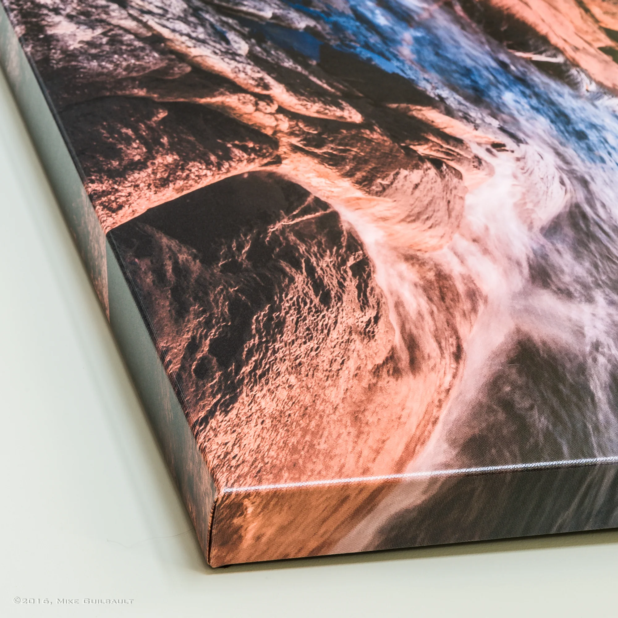 Although we do print smaller sizes on canvas, these are usually selected when you want a portrait that is 20" or larger. You have the option of a traditional Museum canvas, mounted on masonite and designed to be framed, or a Gallery Canvas, where the canvas is 'wrapped' around the sides of a thick stretcher, displaying part of the image either mirrored or extended around the corners. No framing is required on the Gallery Canvas, although mouldings and "Float Frames" are available for these as well.